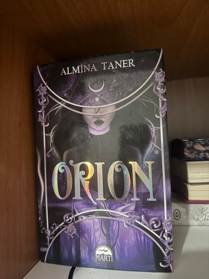 Almina Taner'in Orion adlı romanı, gizemli ve mistik öğelerle süslenmiş koyu kapak tasarımına sahiptir. Martı yayınevinden.
