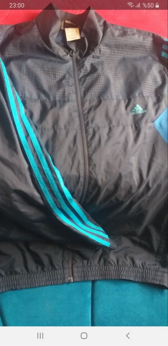 Turkuaz şeritli, fermuarlı Adidas ceket. Üst kısmında havalandırma delikleri ve hafif parlak kumaş bulunur. Birkaç kez kullandım,defosuz ve sorunsuzdur.Geniş kalıptır,ben 180 boy 104 kg kullandım.Cok hafif ve rahattır.Cepleri fermuarlı,içi astarlıdır.#adidas #eşofman #spor