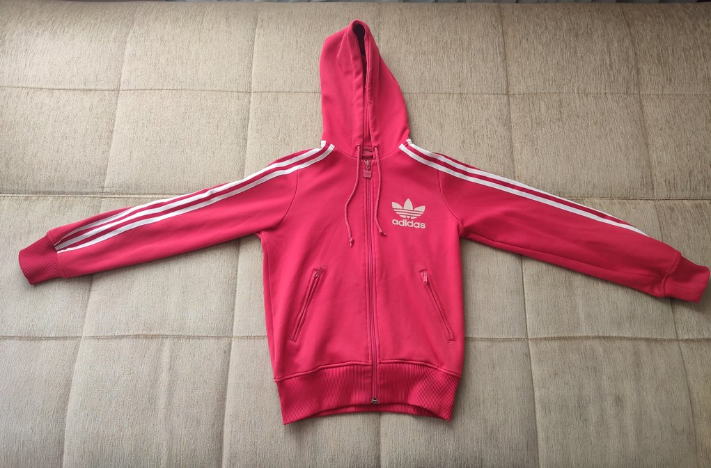 Orjinal Adidas kapşonlu esnek spor çeketi 34 beden sol önde minik defo sol arkada ninik leke var son resimlerde görülüyor ölçüleri ve etiketleri resimlerde mevcut ölçerek alım yapınız