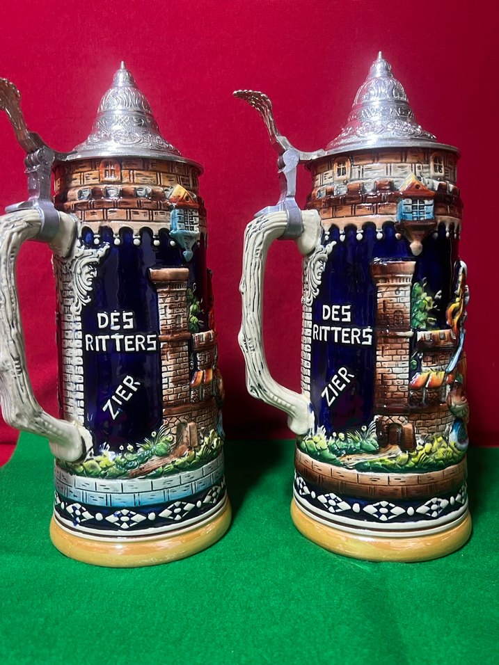 Koyu tonlarda, metal kapaklı klasik seramik bira kupaları. Üzerinde 'DES RITTERS' yazılı ve renkli kale desenleri bulunur.