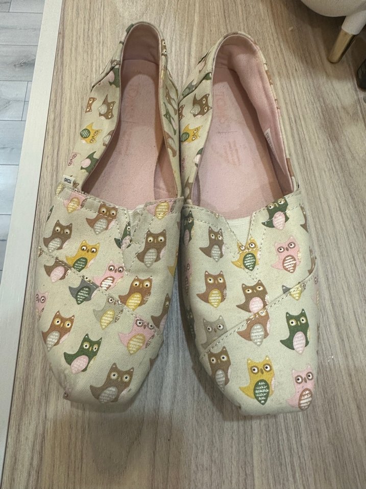 Bej pamuk terlikler, baskılı baykuş deseni, kama topuk ve tokalı detaylarla. Bohem tarzda, günlük kullanım için rahat.