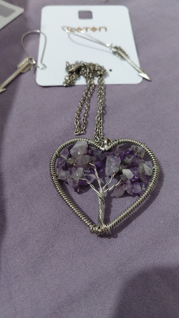 Uzun boylu bohem tarzda, Ametist taşlarla süslenmiş kalp şeklinde ağaç figürlü kolye, gumus zincirli, günlük kullanıma uygun. küpe hediyesidir.yeni ürün kullanılmamıs