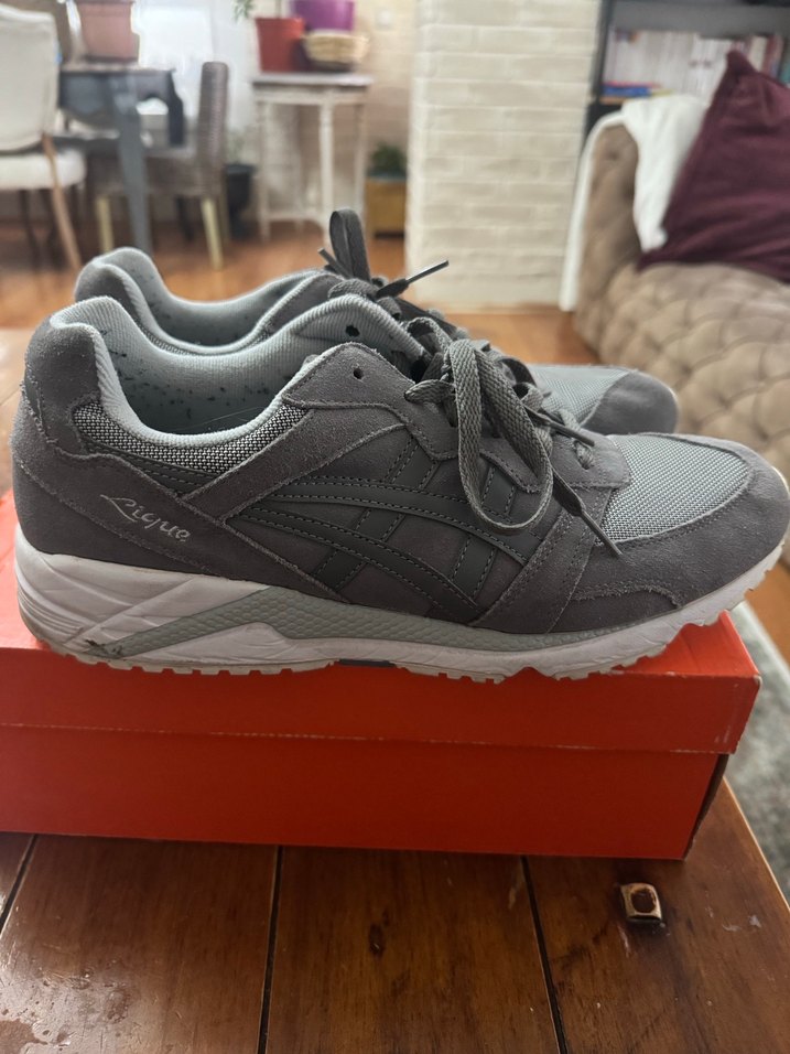 Gri bağcıklı erkek spor ayakkabısı, kauçuk tabanlı, spor ve sokak tarzı için uygun, trendi gündelik görünüm sağlar. Orjinal asics sayılı giyildi 3-4 kez yeni sayılır 46 numara