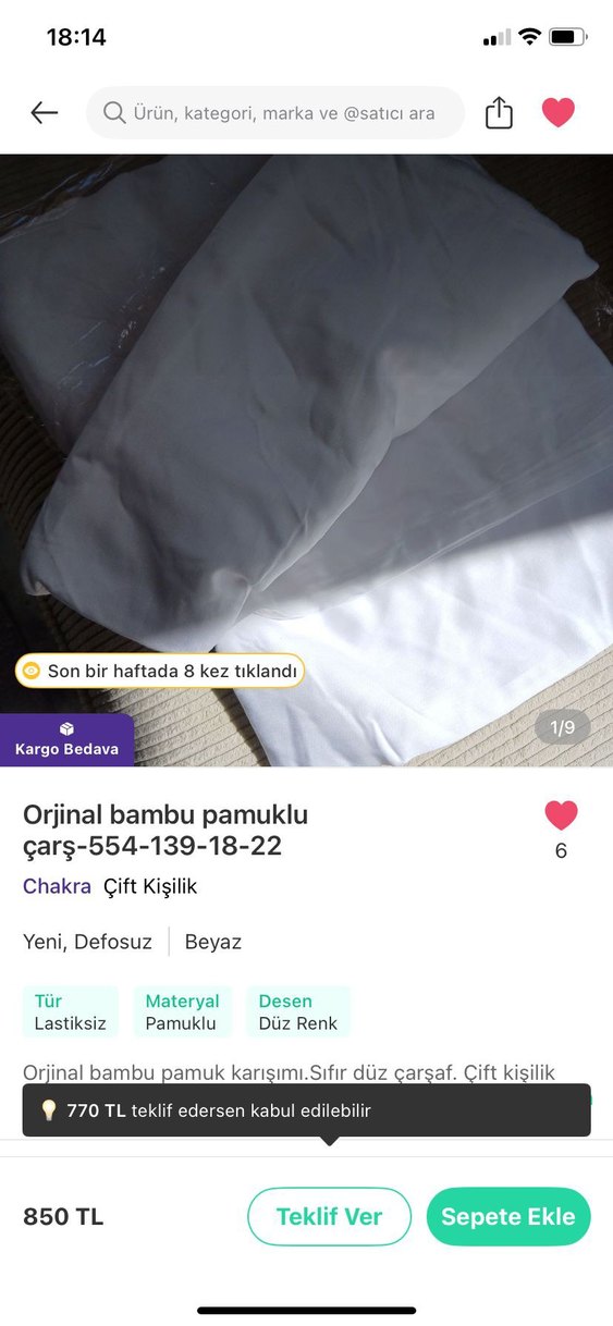 Orjinal bambu pamuk karışımı, çift kişilik, düz beyaz renkli, lastiksiz ve defosuz çarşaf. Yeni ve temiz ürün. ️