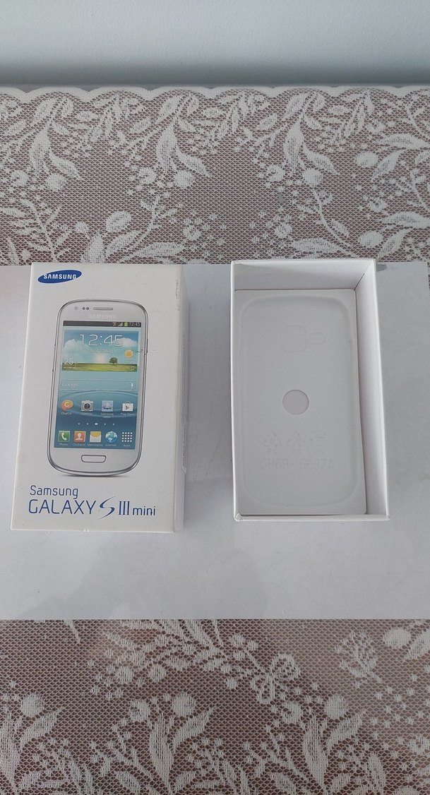 Orijinal kutusunda beyaz Samsung Galaxy S III Mini Android telefon kutusu. Kompakt tasarım ve açık renk.