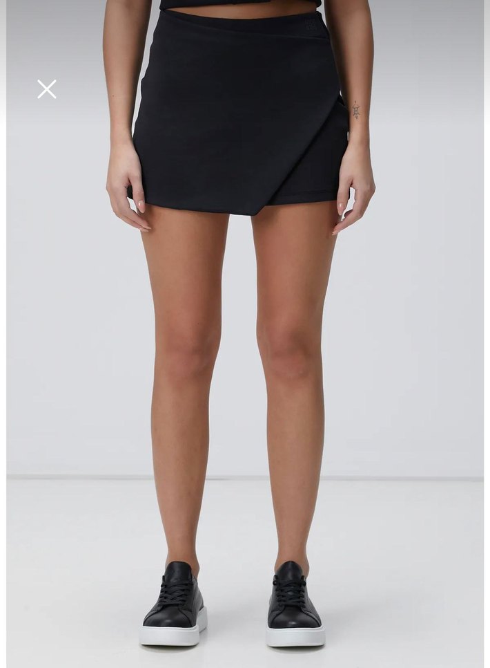 Siyah, düz ve sentetik kumaştan yapılmış, dar kesim mini spor etek. Günlük kullanım için rahat ve şık, cesur athleisure stilinde.