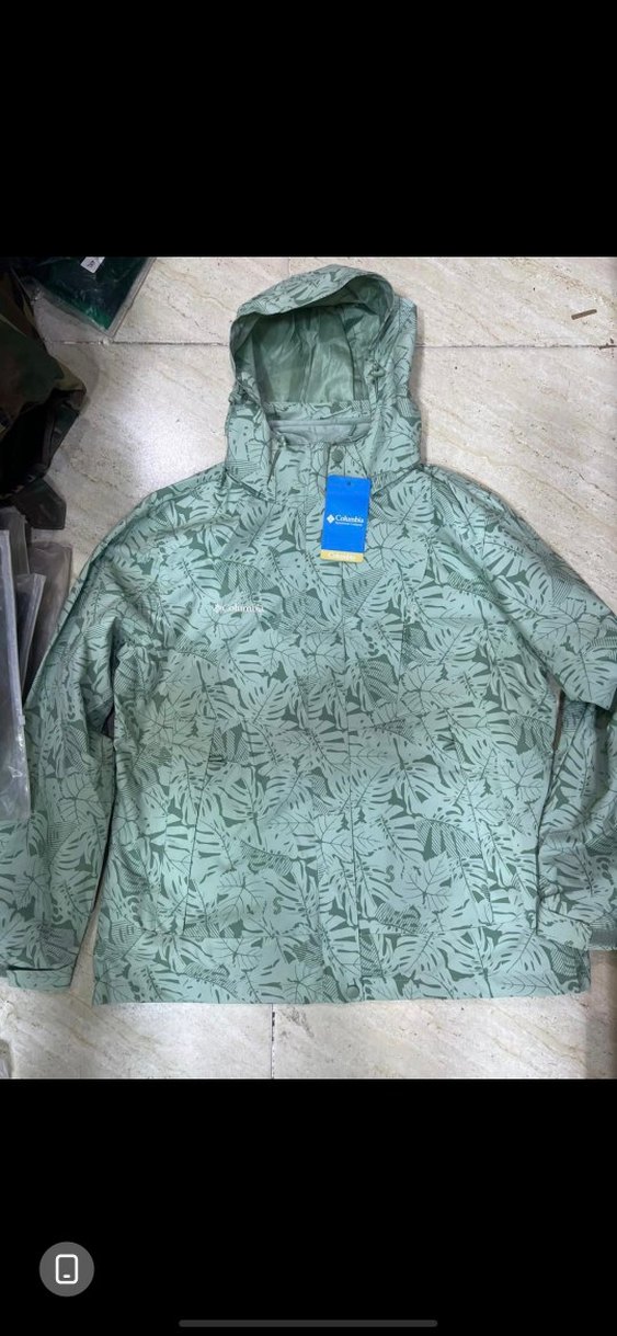 Erkekler için kapüşonlu, uzun kollu baskılı rüzgarlık. Sentetik kumaştan, yeşil-gri desenli, bol kesim ve fermuarlı, dış mekan kullanımı için uygun.
