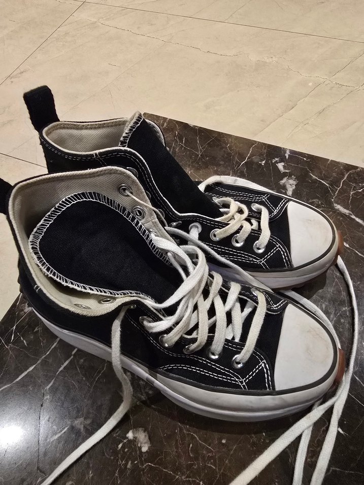 Siyah renk, düz tabanlı, kauçuk tabanlı bağcıklı kadın spor ayakkabısı. Günlük rahat kullanıma uygun, grunge punk tarzında. %100 orijinaldir..
