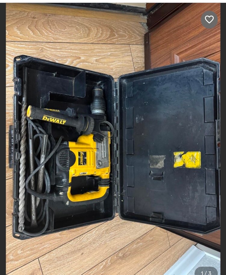 Siyah taşıma kutusunda sarı Dewalt matkap ve aksesuarları bulunur. İçinde matkap, uçlar ve kablo yer alır. ⚙️