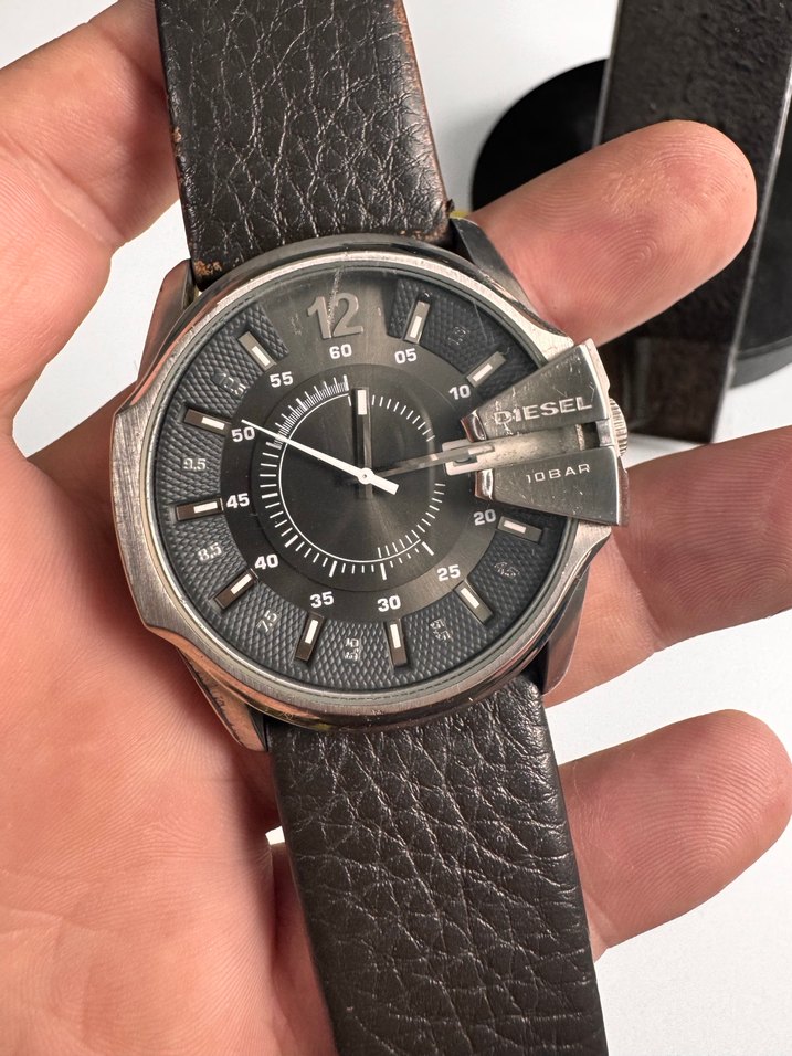 Diesel markalı, koyu kahverengi deri kayışlı, detaylı siyah kadranlı ve koruyucu kurma kapağı bulunan biker tarzı erkek saat. ⌚