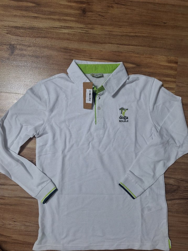 Orjinal doğa koleji beyaz uzun kollu, polo tişört, yakalı ve düğmeli. Etiketi üstünde hiç kullanılmamış baskılı logolu ürün.