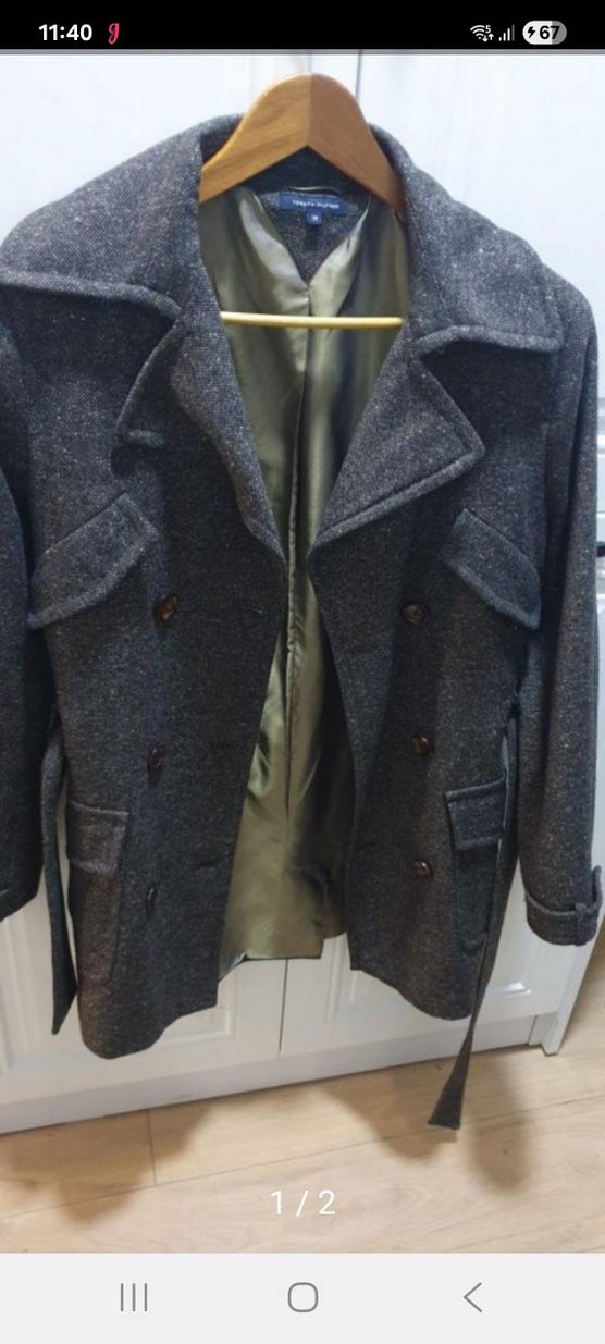 Gri yün kabanı, düğmeli ve kesik yaka detayına sahiptir. Uzun kollu, midi boy ve regular fit modeldir, günlük iş stiline uygundur.