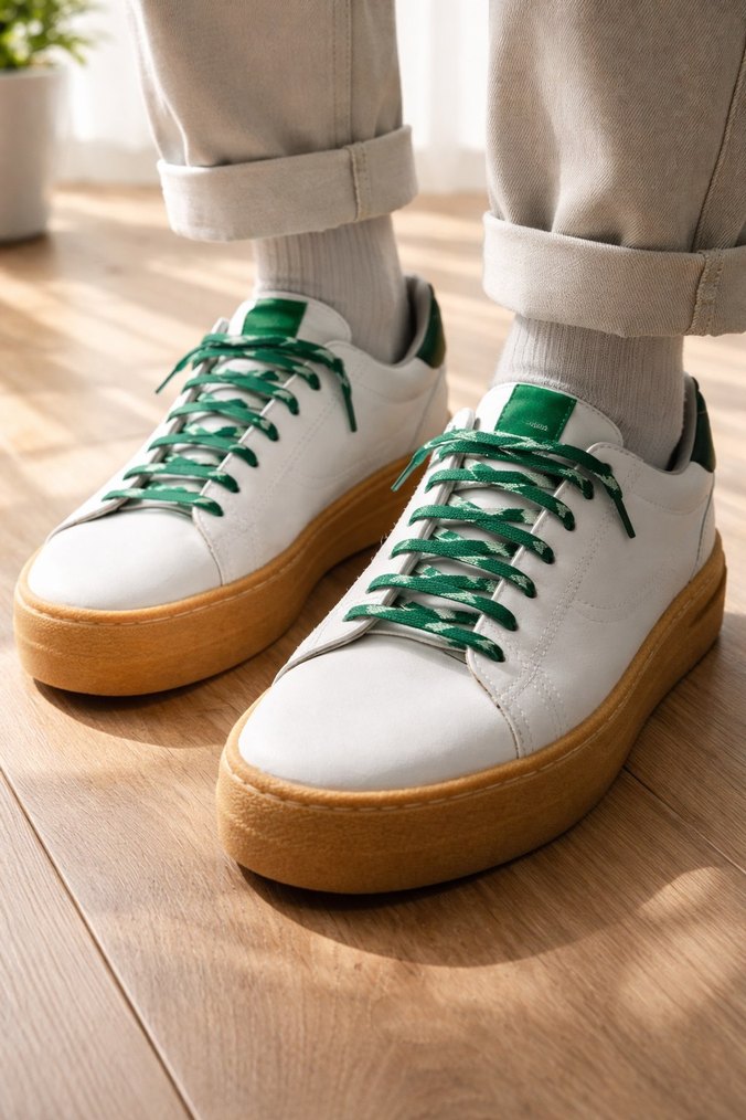 Yeşil bağcıklı ve düz kauçuk tabanlı kadın spor ayakkabısıdır. Renkli ve rahat tasarımıyla spor ve günlük kullanıma uygundur. 42 numara