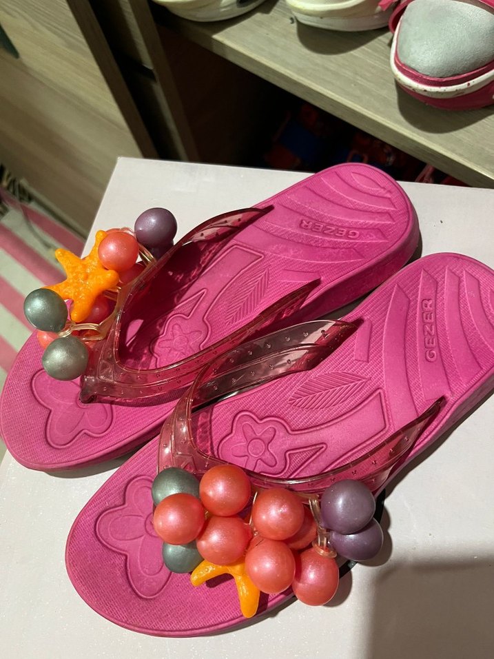 Pembe renkli kadın terlikleri yaz aksamlari havuz ve denizin vazgeçilmezi özellikle ustundeki üzüm desenler çok tatlı bir hava veriyor elimde yedegi var onu giyiyorum hala bunu giymedim 2 defa dışında orjinal gezer marka efsane terliktir