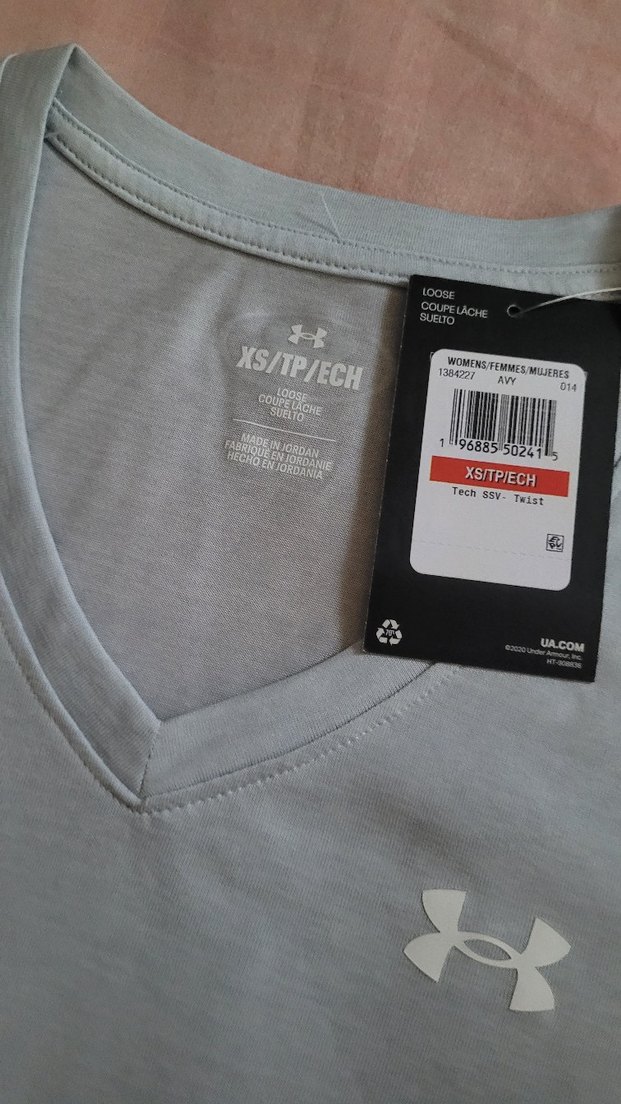 Orjinal etiketli Gri Under Armour kadın tişörtü, XS beden, bol kesim ve V yaka tasarımı ile. Önünde marka logosu bulunur. ♀️