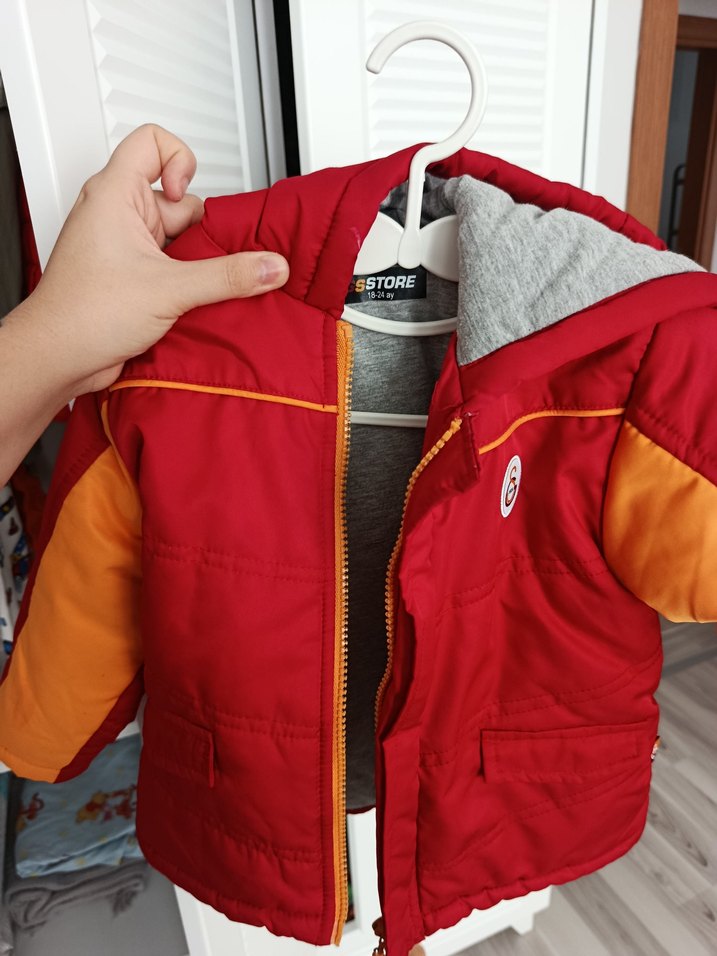 Fermuarlı, kesimli ve notlu yaka detaylı kırmızı erkek çocuk montu. İç kısmı yumuşak dokulu gri kumaşlı, sokak stilinde tasarlanmıştır.