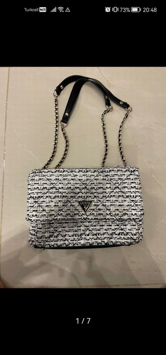 Guess markalı, beyaz ve gri tonlarda desenli, örgü görünümlü tüvit kumaştan yapılmış, zincir askılı bohem tarzda kadın çantası.
