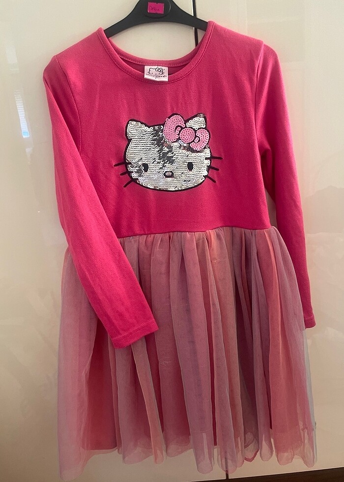 uzun kollu hello kitty elbise çok az giyildi, üst tarafı kumaş üzeri pul işlemeli, eteği tül, astarlı elbise resimde görüldüğü gibi bir iki yerinde iplik çekmesi var