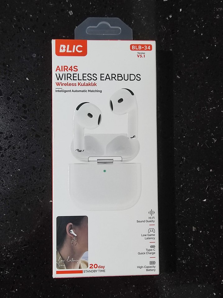 BLIC AIR4S WIRELESS EARBUDS (BLB-34 V5.1) Temel Özellikleri Kulaklığın kutusunda belirtilen ve arama sonuçlarıyla desteklenen başlıca özellikleri şunlardır: Genel Özellikler Model: AIR4S WIRELESS EARBUDS Ürün Kodu: BLB-34 Bluetooth Versiyonu: V5.1 (Arama sonuçlarında ve kutuda belirtilmiştir) Tasarım: Kulak İçi (Earbuds) Bağlantı Tipi: Tam Kablosuz Ses ve Teknoloji Ses Kalitesi: Hi-Fi Sound Quality (Yüksek Kaliteli Ses) Oyun Performansı: Low Game Latency (Düşük Oyun Gecikmesi) Eşleştirme: Intelligent Automatic Matching (Akıllı Otomatik Eşleştirme) Pil ve Şarj Şarj Portu: Type-C Quick Charge (Type-C Hızlı Şarj) Batarya: High-Capacity Battery (Yüksek Kapasiteli Batarya) Bekleme Süresi: 20 gün STANDBY TIME (20 günlük bekleme süresi) Ek Özellikler Suya & Tere Dayanıklılık: Evet Dokunmatik: Evet Garanti: 2 yıl ithalatçı firma garantili (Kutunun üzerinde 24 ay garanti bilgisi ve ithalatçı firmanın adresi mevcuttur.) Kullanma Kılavuzu ve Şarj kablosu kutu içerisinde mevcuttur.