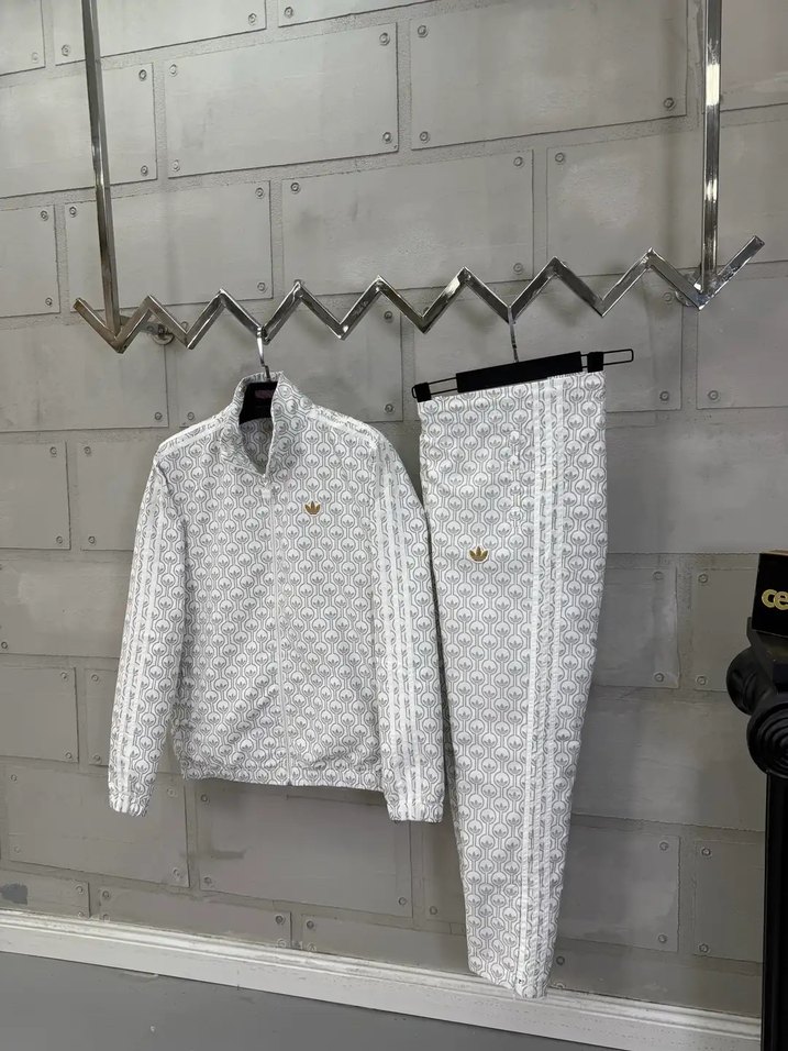Nakışlı beyaz ve gri desenli, örme sentetik kumaştan yapılmış, uzun kollu ve yüksek yakalı eşofman altı, günlük kullanıma uygundur. ♀️