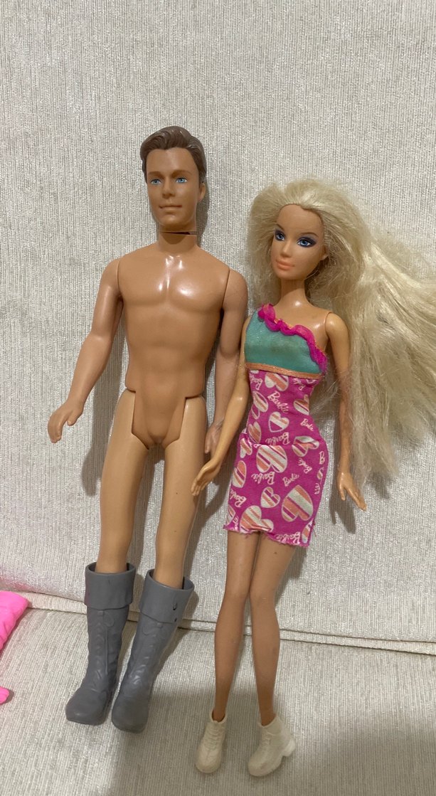 Kadın bebek, pembe kalp desenli pastel tonlarda elbise giyiyor, uzun sarı saçlı ve yumuşak ifadeli.