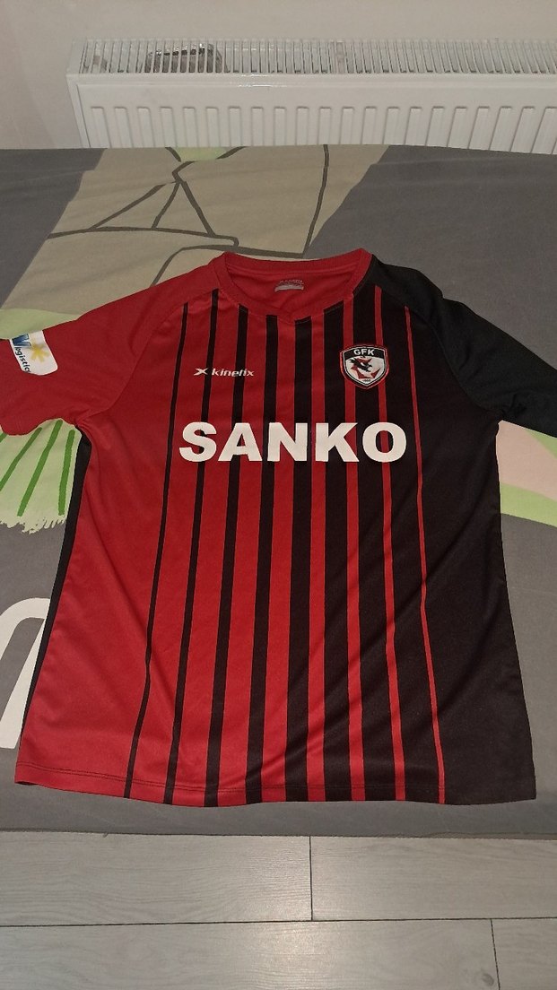 Kinetix markalı, kısa kollu, yuvarlak yakalı, kırmızı siyah baskılı, sentetik kumaştan erkek spor tişörtü. Önünde 'SANKO' yazısı ve cırt cırt detay bulunur.