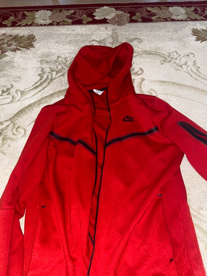 Koyu kırmızı renkte, kapüşonlu ve fermuarlı, uzun kollu Nike erkek tech. Yumuşak kumaştan, dış mekan için uygun, fermuarlı cepleri var.