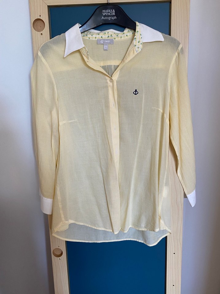 Ürün sayılı giyilmiş sarı renk beyazı çizgili beyaz manşet kol kusursuz