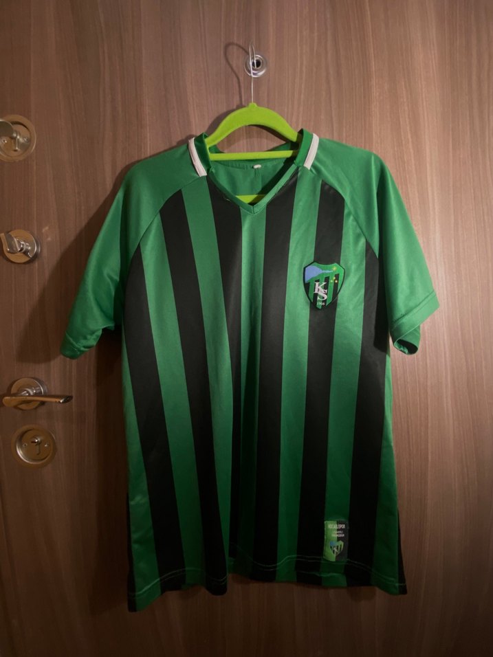 Koyu yeşil ve siyah çizgili, kısa kollu, yuvarlak yakalı, düğmeli erkek spor tişört. Sentetik kumaştan, salaş kesimle günlük kullanım için uygundur. ⚽
