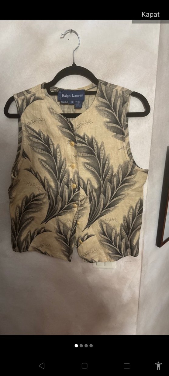Düğmeli ön kısmı ve gri yaprak desenli keten, kolsuz yelek. Salaş kesim ve askısız yakasıyla vintage bohem tarzında, günlük kullanıma uygun.