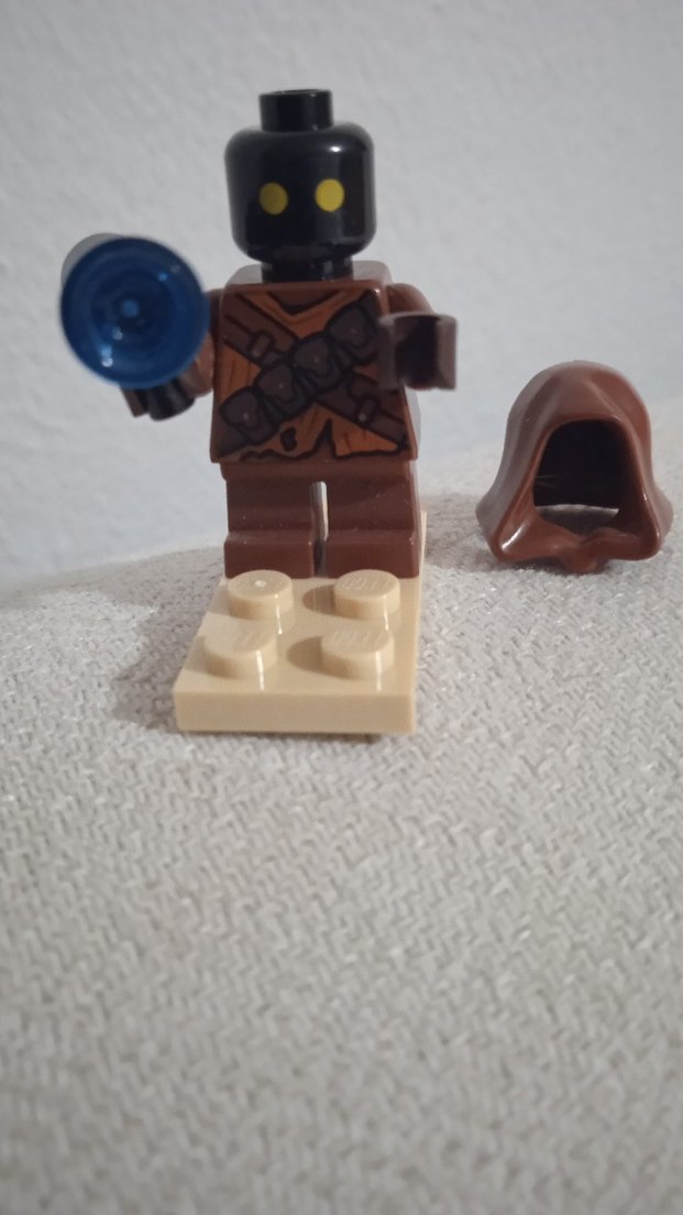 Siyah başlı, sarı gözlü koyu kahverengi Lego figür, mavi aksesuar tutuyor. Ayrı kahverengi kapüşon parçası içerir.