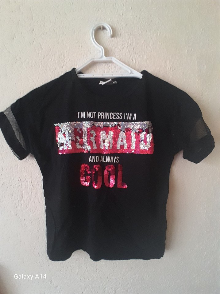 Siyah, kısa kollu, pul işlemeli baskılı, dar kesim kız çocuk tişörtü, yuvarlak yaka ile trendy bir stil sunar. ✨