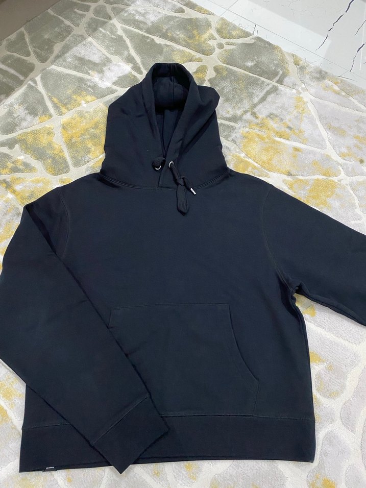 Siyah kapüşonlu sweatshirt, yumuşak ve sıcak kumaştan, bol kesim ve uzun kollu. Günlük kullanıma uygun rahat bir model.