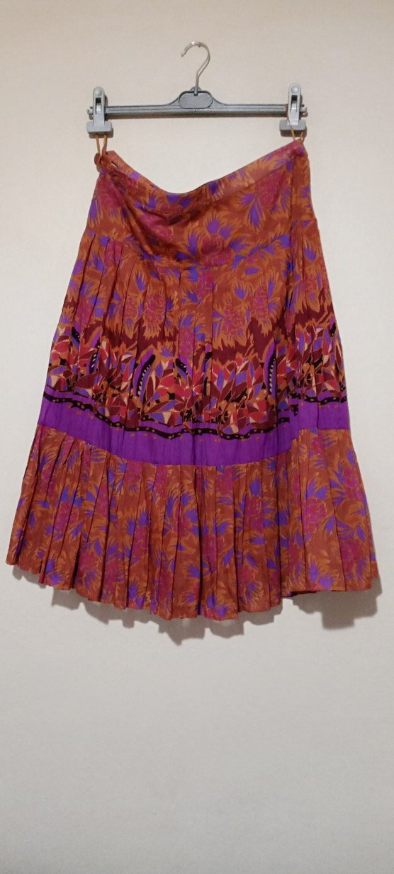 Orijinal MANGO Marka Renkli ve pilili, bohem tarzda uzun kadın eteği. Mor ve sıcak tonlarda batik desenli, yumuşak dokulu kumaştan, bol kesim.