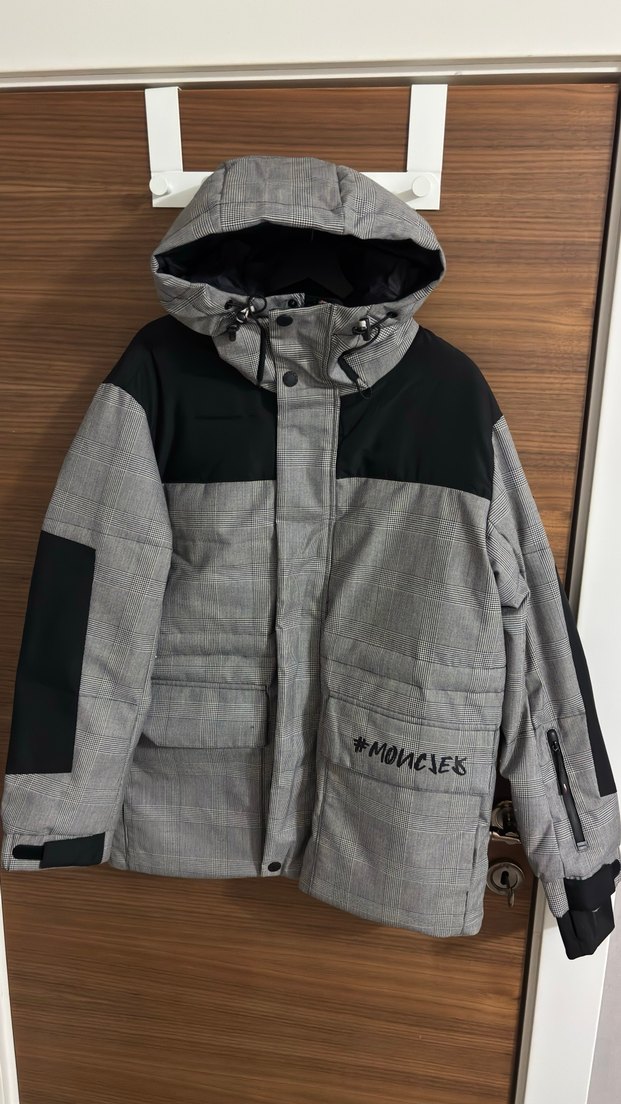 Moncler kaz tüyü kayak montu. Gri renkte, düğmeli ön ve kapüşonlu erkek mont. 85 kiloya kadar kullanılabilir.