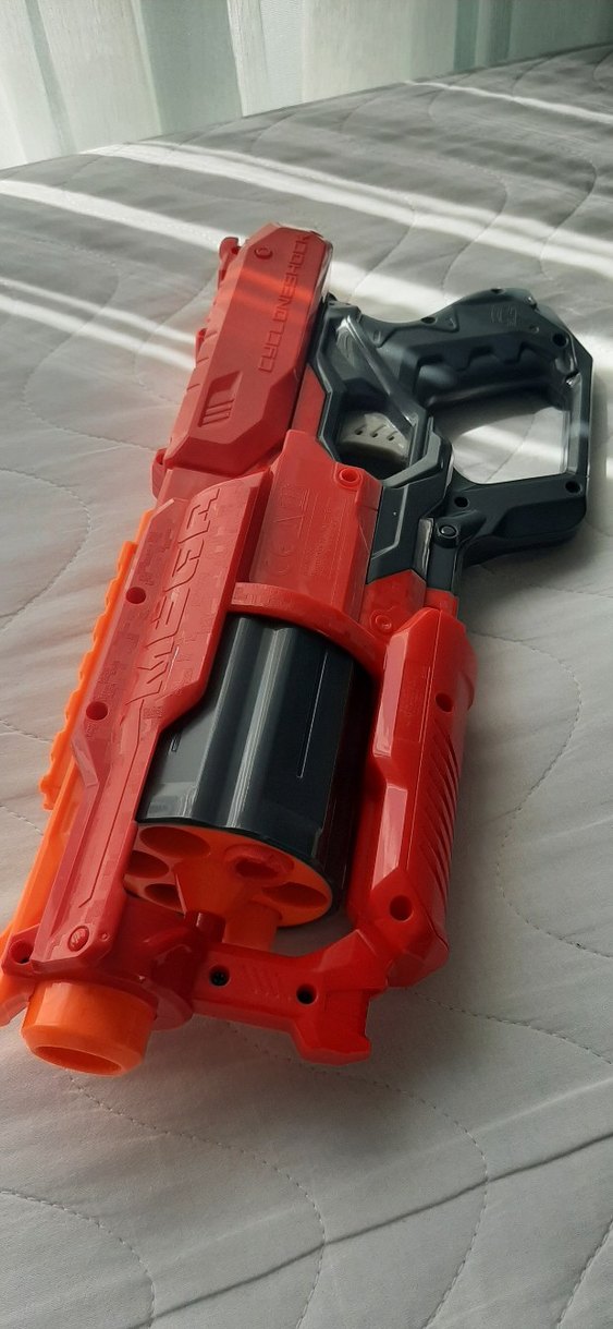 Koyu kırmızı renkli oyuncak tabanca, döner namlu ve ergonomik tutma yeri ile hayal gücünü destekler. elimdeki mermileride gondericem