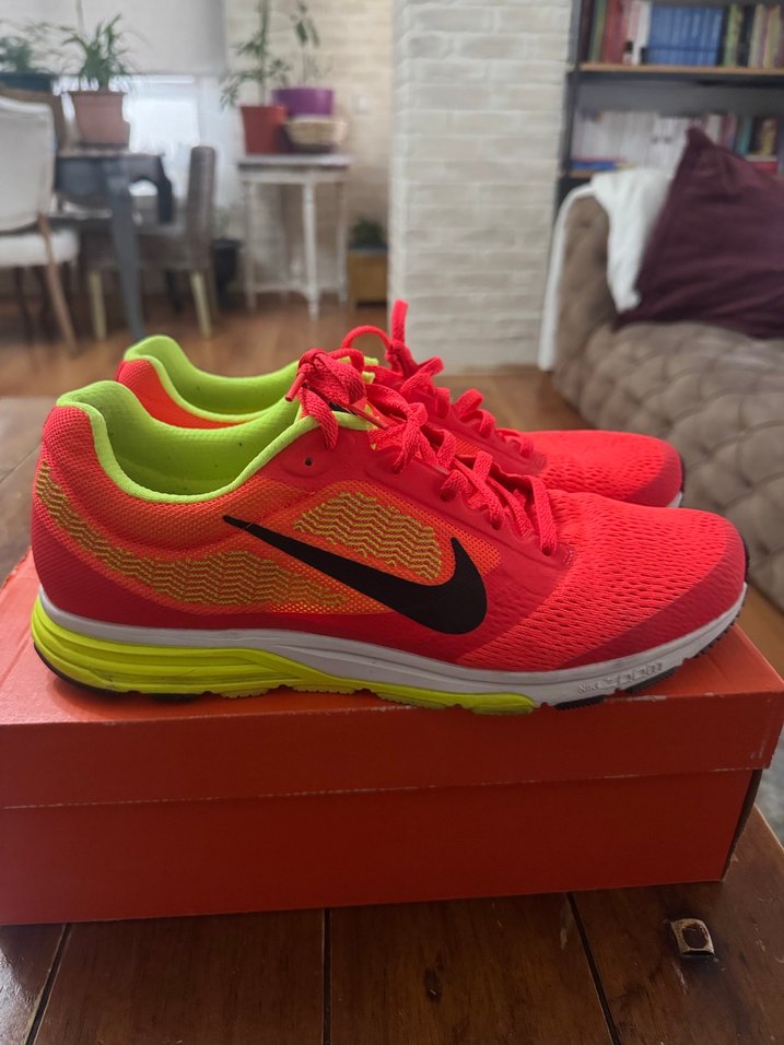 Nike markalı, bağcıklı, düz tabanlı erkek spor ayakkabısı. Canlı kırmızı ve neon yeşil renklerle sokak stili için uygun. Sayılı giyildi yeni sayılır orjinal 45 numara