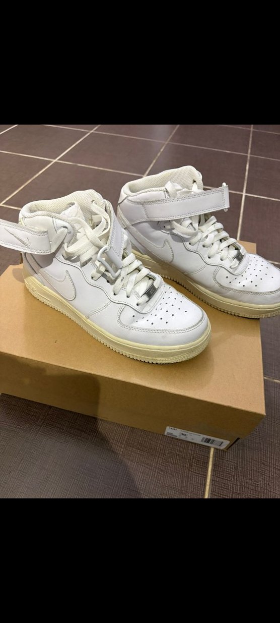 Beyaz, kayışlı ve bağcıklı kadın spor ayakkabısı. Kauçuk malzemeden, düz yüzeyli ve wedge topuklu, spor tarzına uygun orjinal nike air force serisinden bilekli olması spor kombinlere daha rahat ayak uydurmanızı sağlar tertemiz ayakkabı