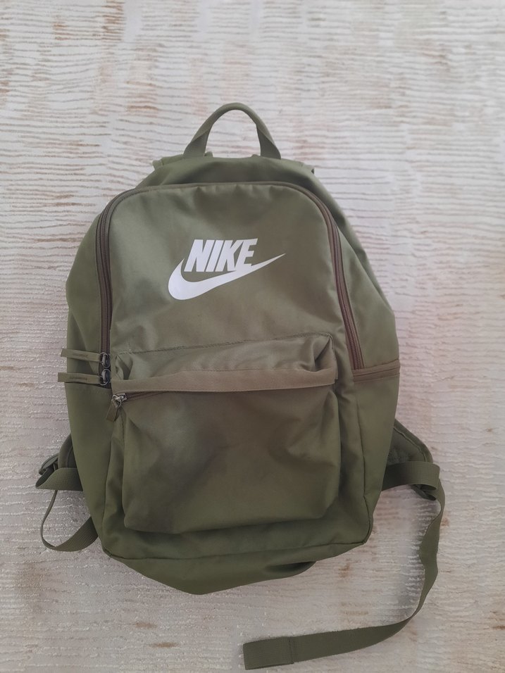 Nike marka yeşil renkli, fermuarlı ceplere sahip sırt çantasıdır. Günlük kullanım için sade ve fonksiyonel tasarıma sahiptir.