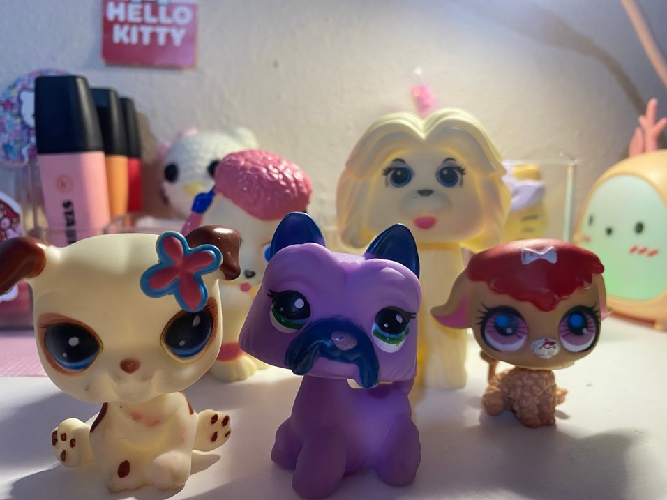 Mor renkli, büyük gözlü detaylı yüz ifadesine sahip renkli bir köpek aksiyon figürüdür.