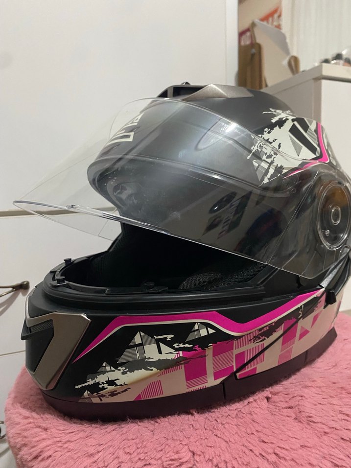 Koyu pembe baskılı motosiklet kaskı, kayışlı kapama ve şeffaf vizöre sahip, rock punk sokak stilini yansıtıyor. Plastik malzemeden üretilmiştir. ️