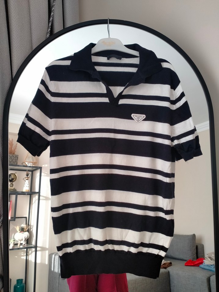 unisex üründür kısa kollu, düğmeli yakalı pamuklu polo tişört. Siyah beyaz çizgili, bol kesim ve günlük sokak stili için uygundur. orjinaldir #prada