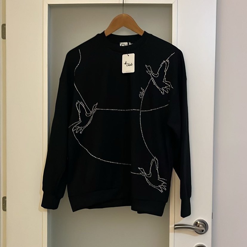 Beymen Club marka, siyah renk sweatshirt. Üzerinde kuş figürleri bulunmaktadır.tüm detayları ve tüm etiketleri fotoğraflarda mevcuttur,modal kumaş harika bir sweet,iki koltuk arası 58 cm boyu 68 cm