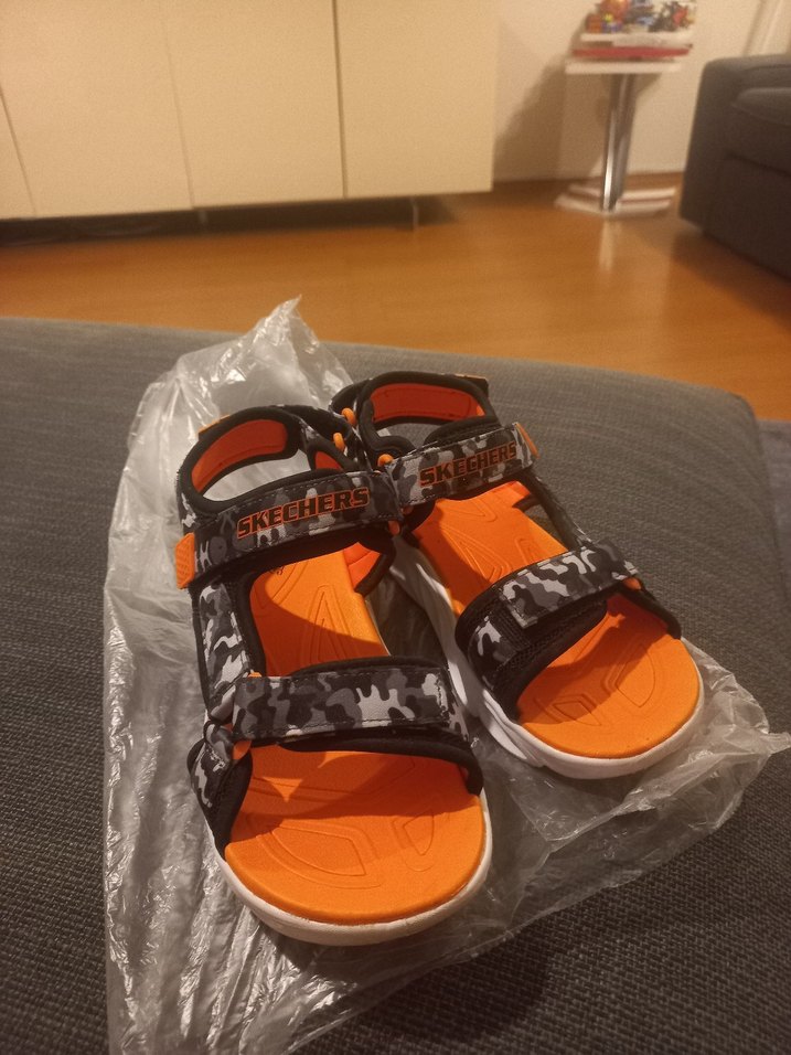 orjinal skechers kamuflaj desenli, turuncu tabanlı, tokalı ayarlanabilir , rahat kauçuk tabanlı erkek çocuk sandalet .numarası küçüldüğü icin sadece bir kez giyilebildi.sifirdan farkı yok