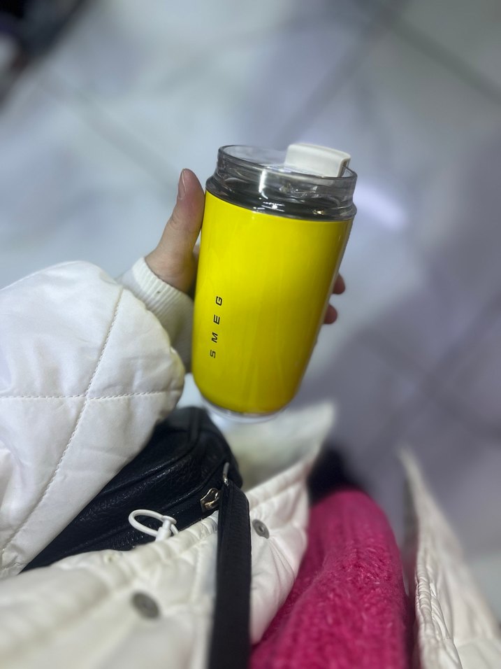 Parlak sarı renkte, Smeg termos. Güvenli kapak ve dayanıklı yapıya sahip, içecekleri sıcak tutar. Renkli kullanıma uygun.