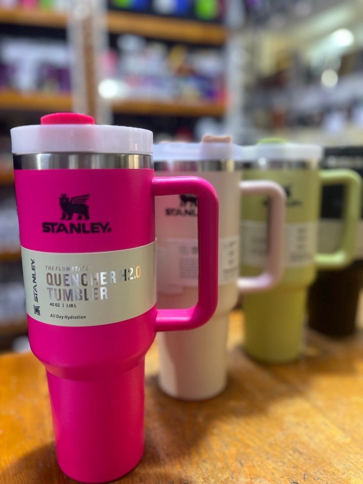 Stanley pembe termos bardak, renkli tasarımı ve kolay taşınabilen sağlam kulpu ile dikkat çekiyor. Quencher etiketi bulunur.