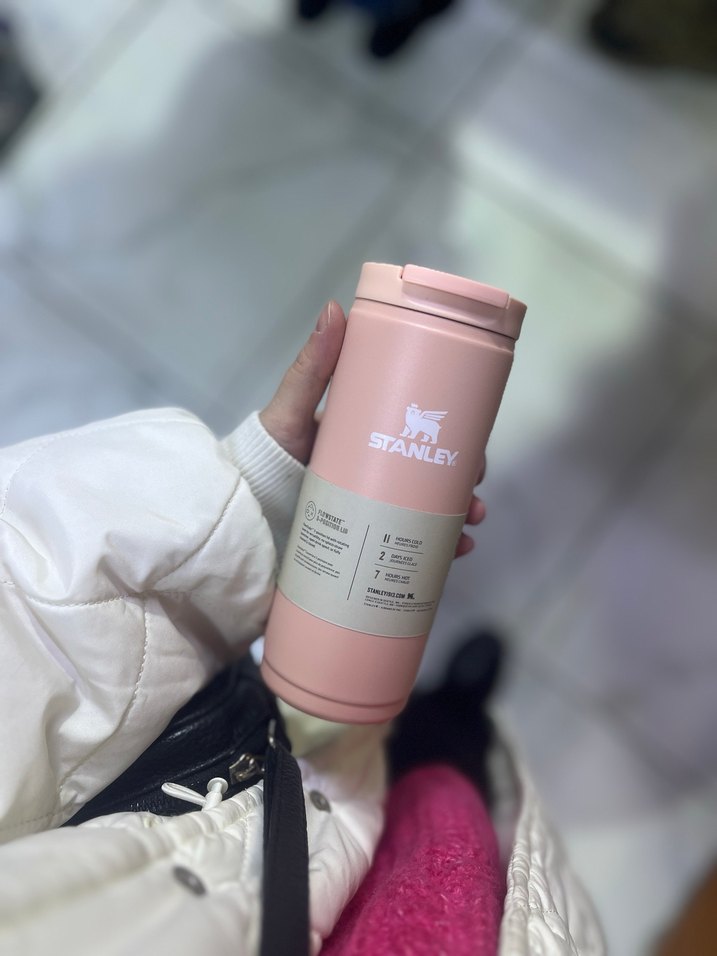 Stanley marka pastel pembe termos şişesi, içecekleri uzun süre sıcak veya soğuk tutar, dayanıklı ve taşınması kolaydır. Renkleri mevcuttur