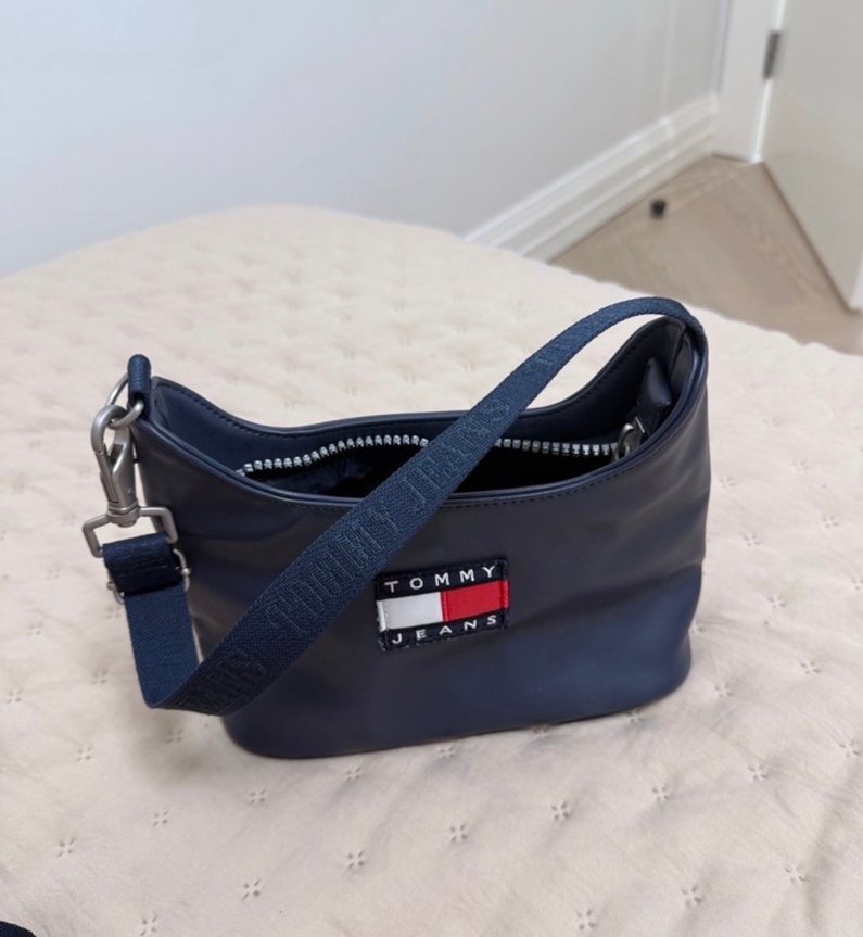 Mavi deri kadın omuz çantası, tokalı askı ve baskılı detaylara sahip. Minimalist tasarımıyla günlük kullanıma uygundur. Marka etiketi "Tommy Jeans" yazılıdır. Sayılı kullanılmıştır tertemiz yeni gibi