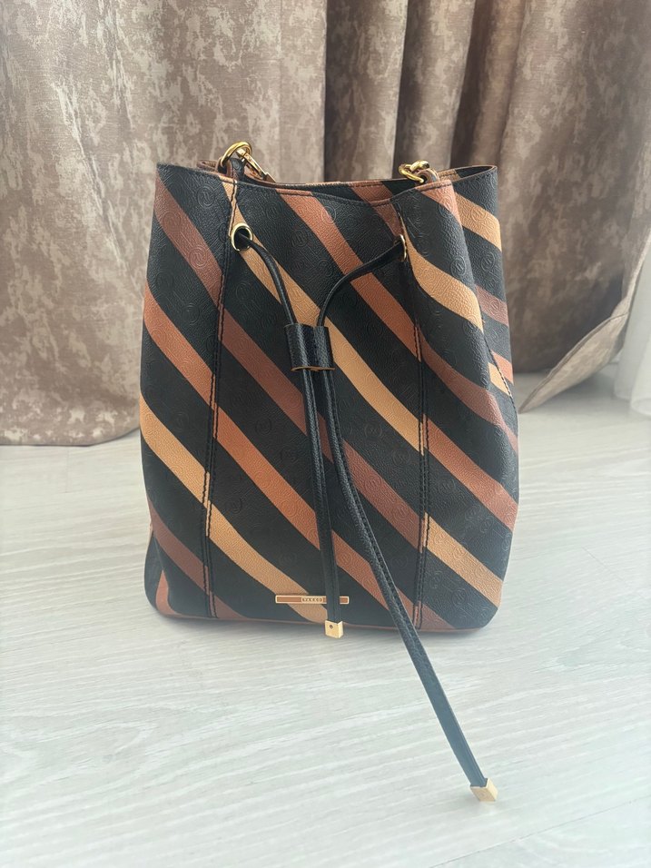 Koyu kahverengi deri, çizgili desene ve tokalı detaylara sahip kadın omuz çantası. Günlük kullanıma uygun, trend sokak stili için ideal.