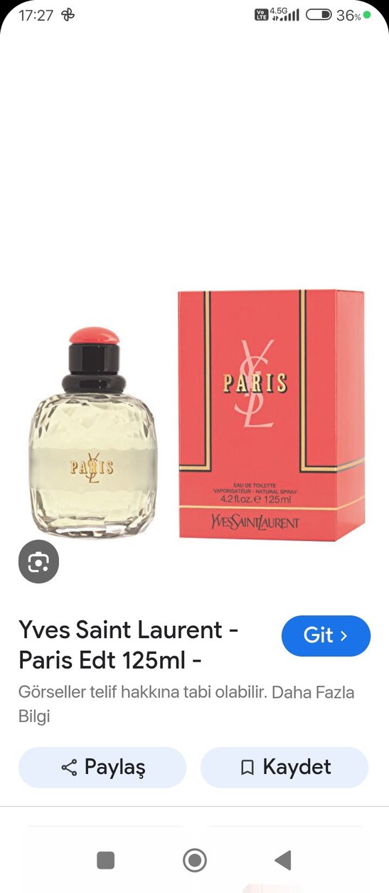 Yves Saint Laurent Paris Eau de Toilette kadın parfümü, nefis bir kokudur 125ml nin yarisi 65 ml kadari doludur beymenden alindi yuzde yuz orjinal saticilara inanmayin taklitleri var internette 15000 tl fiyati vardi beymende